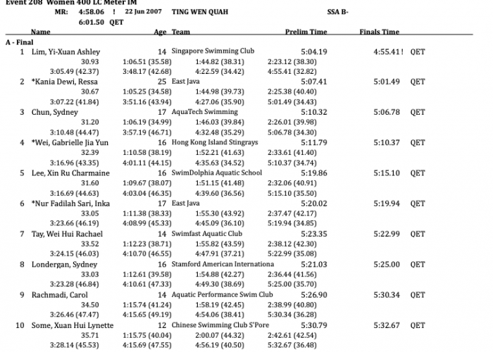 Yi-Xuan Ashley Lim established her dominance on the women’s side, dropping a 4:55.41 for the win and the meet record. The fourteen-year-old left the rest of the field, downing Ressa Kania Dewi (5:06.78) and Sydney Chun (5:06.78), two seasoned veterans. Gabrielle Jia Yun Wei and Xin Ru Charmaine Lee turned heads with times of 5:10.37 and 5:15.10, respectively; while Inka Nur Fadilah Sari (5:19.94) and Wei Hui Rachael Tay (5:22.99) sought to climb in the rankings.