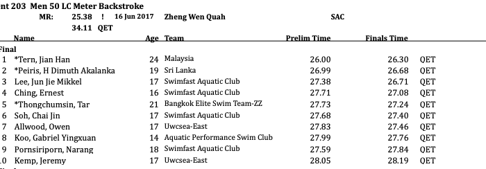 Jian Han Tern took his victory lap in the men’s 50 back after an impressive showing this morning, turning in a time of 26.30 for the win. H Dimuth Akalanka Peiris earned the silver with a 26.68 over Jun Jie Mikkel Lee (26.71). Ernest Ching and Tar Thongchumsin claimed fourth and fifth with times of 27.08 and 27.24, respectively; while Chai Jin Soh’s time of 27.40 was good enough for top six. Owen Allwood (27.46) furthered his already impressive individual schedule with a seventh place performance; while Gabriel Yingxuan Koo (27.76), Narang Pornsiriporn (27.84), and Jeremy Kemp (28.19) topped off the heat.