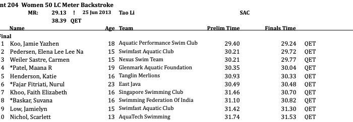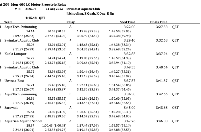 Aquatech Swimming holds the first national championship relay title of the meet, charging home with a 3:27.38 to steal the win. Swimfast Aquatic Club lived up to its name, clinching second by a wide margin over Kuala Lumpur (3:37.94).