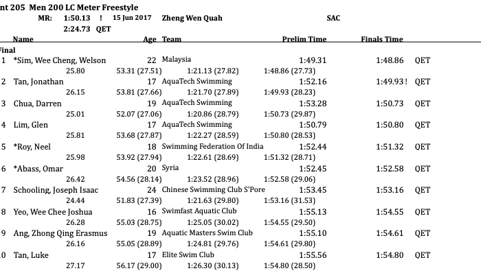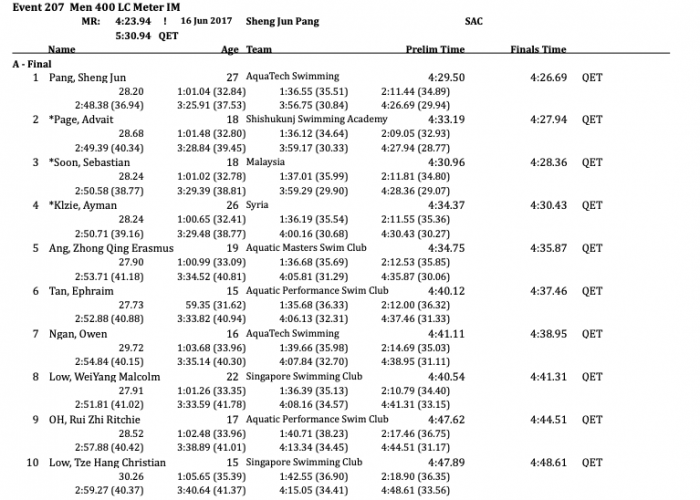 Zhong Qing Erasmus Ang broke into the top five with a time of 4:35.87, bumping Ephraim Tan (4:37.46) to sixth. Owen Ngan made yet another top ten appearance with his 4:38.95, good enough for seventh over WeiYang Malcolm Low (4:41.31). Rui Zhi Ritchie (4:44.51) and Tze Hang Christian Low (4:48.61) completed the nation’s top ten.