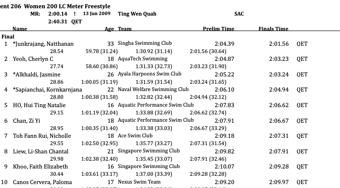 Kornkarnjana Sapianchai destroyed her time from prelims, going 2:04.94 to nab a spot in the top four, as Hui Ting Natalie Ho (2:06.62) fell short of the upset. Zi Yi Chan forced her name on the scene with a 2:06.67, as Nicholle Toh Fann Rui came from behind to post a 2:07.31 of her own.