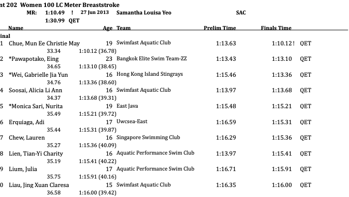 Lauren Chew (1:15.36) took seventh by a narrow margin over Tian-Yi Charity Lien (1:15.41); while Julia Lium (1:15.91) and Jing Xuan Claresa Liau (1:16.00) took ninth and tenth, respectively.