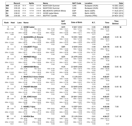 The six-day meet started with the women’s 400 free featuring Isabel Gose and Simona Quadarella with the 50 fly, 100m breaststroke, 200 back and 4×50 free to come.
