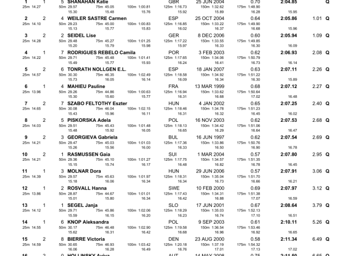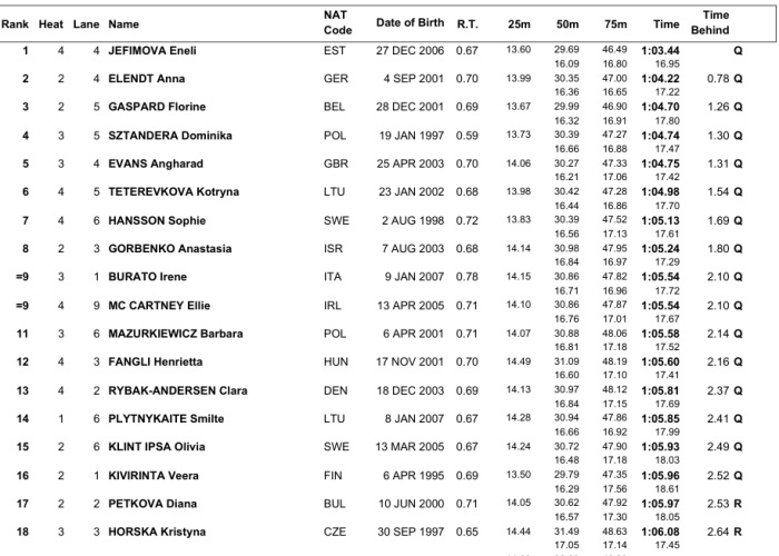 Eneli Jefimova set a swift pace in pursuit of the defence of her title as she went within 0.03 of her Estonian record in 1:03.44. Anna Elendt, winner of the world title in Singapore, was next home in 1:04.22 followed by Florine Gaspard (1:04.70),