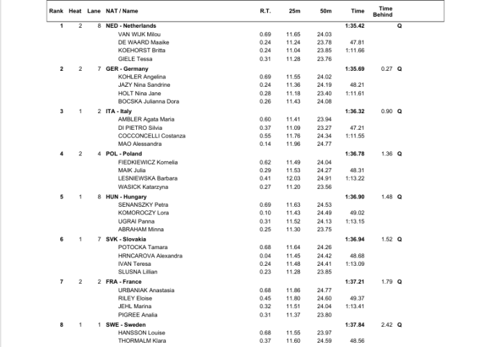 The Netherlands led the way into the final in 1:35.42 with Marrit Steenbergen to come in. Germany booked the adjacent lane in 1:35.69n with Italy – featuring a 23.27 split from Silvia di Pietro – qualifying third in 1:36.32 with Sara Curtis set for the final. Sweden claimed the eighth spot for the final with Denmark the team to be locked out.