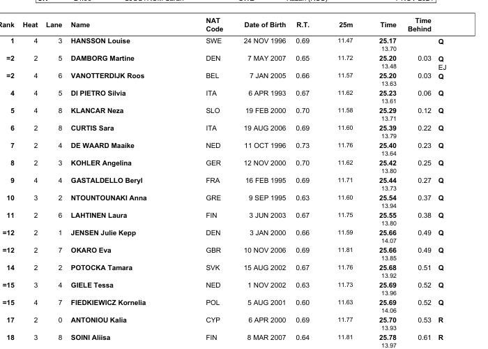 Louise Hansson led the way in 25.17 with Martine Damborg and Roos Vanotterdijk both clocking 25.20. It was a european junior record for the former who shaved 0.01 from her own mark set last year in Copenhagen.