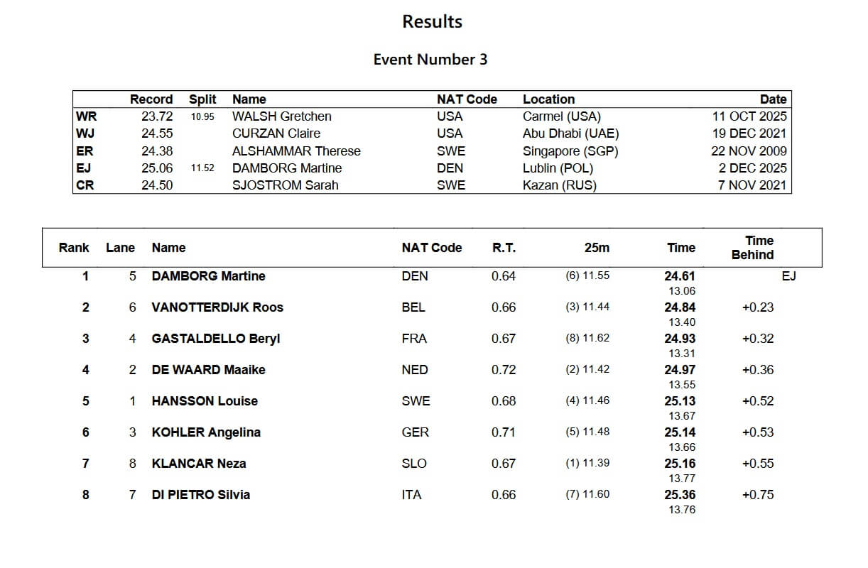 Nope, said Martine Dambourg. The Danish junior swimmer absolutely blasted the final 25 meters to go from sixth to the win in 24.61, her margin of victory .23 seconds. For the third straight swim, she lowered her European Junior record, this one clubbing .45 seconds off the time she set in semifinals. And she made a decent run at Claire Curzan’s world junior record of 24.55. It’s also the Danish senior record.