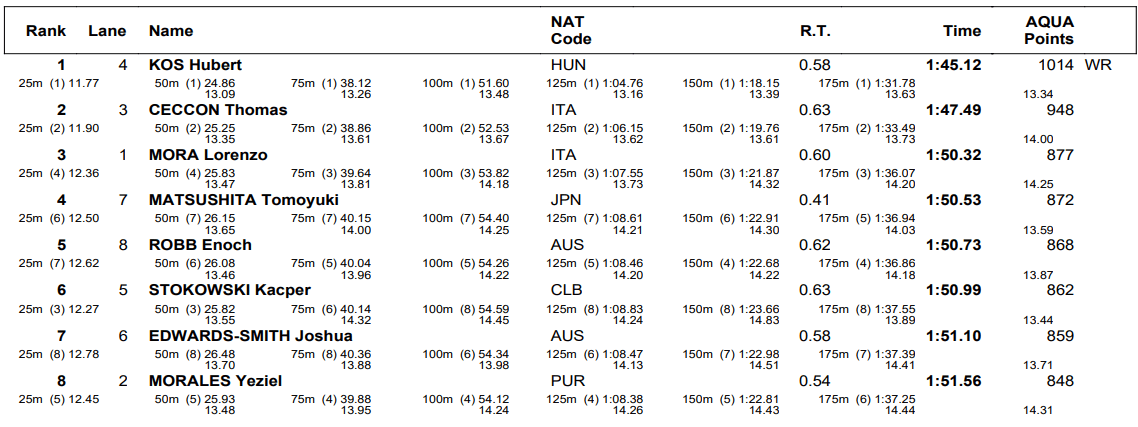 Kos was chasing a mark that had lasted almost a decade, the time of 1:45.63 established by Mitch Larkin in Sydney in 2015. Kos nearly nipped that time at the Short Course World Championships last December, thrilling a partisan Hungarian crowd in Budapest with a dominant win while falling just two hundredths short of the all-time best. In Toronto, however, Kos would not be denied.