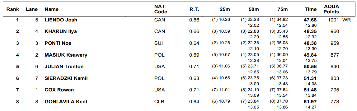 In another thrilling result for the home crowd, Canada finished 1-2 as Kharun took second in 48.35, three hundredths ahead of Ponti’s 48.38. Ponti had been going for the World Cup crown in the event, but the Canadians beat him to the finish while claiming his previous global mark.