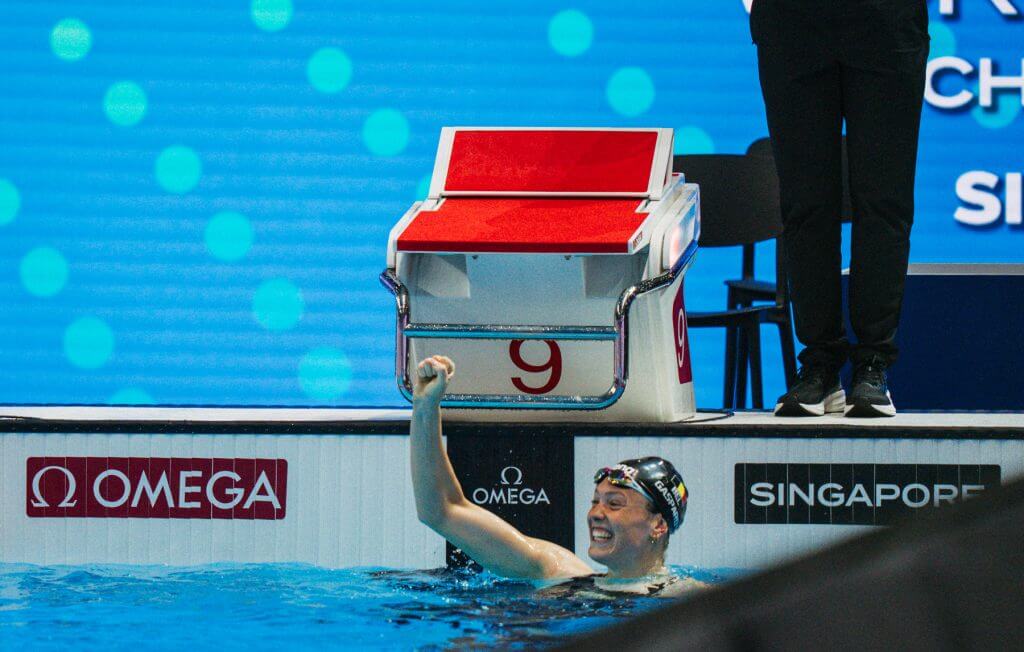 The 23-year-old first set about the 50m breaststroke where she stopped the clock at 29.33 to shave 0.15 from the 29.48 record she set last month at the World Cup. She returned for the 100 free where she went 52.57, 0.04 inside Roos Vanotterdijk’s record (52.61) from December 2024.
