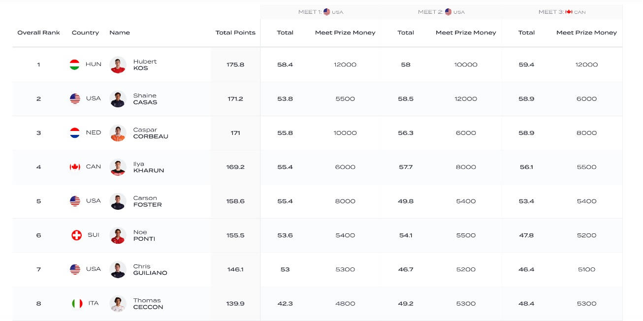 Kos captured the men’s crown in dominant fashion, as he accumulated 175.8 points during the circuit, which enabled him to finish ahead of American Shaine Casas (171.2 points) and the Netherlands’ Caspar Corbeau (171.0 points). Kos went a perfect 9-for-9 in the backstroke events during World Cup action, and his visit to Toronto produced world records in the 100 backstroke and 200 backstroke.