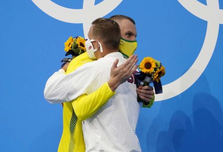 Kyle Chalmers (in yellow) hugs Caeleb Dressel on the Olympic podium after the men’s 100 free final in Tokyo — Photo Courtesy: Rob Schumacher/USA TODAY Sports