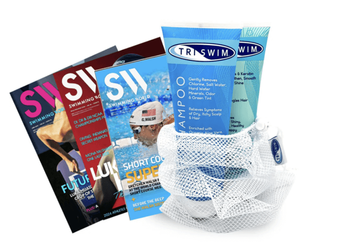 Receive a Free Three-Month Swimming World Subscription with your purchase of the TRISWIM Shampoo/Conditioner Gift Set — a bonus every swimmer will love. The bundle includes Chlorine Removal Shampoo, which gently removes chlorine, bromine, salt water, hard-water minerals, and odors while the Conditioner restores shine, softness, and overall hair health.
