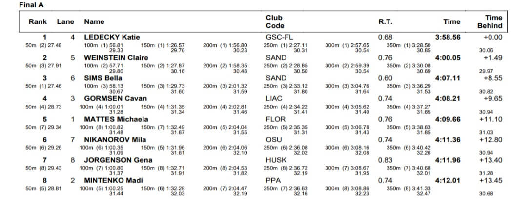 The race went as expected from prelims and based on how Ledecky and Weinstein have been this week. There have been several swims like that on the women’s side, leading to a familiar, veteran team.