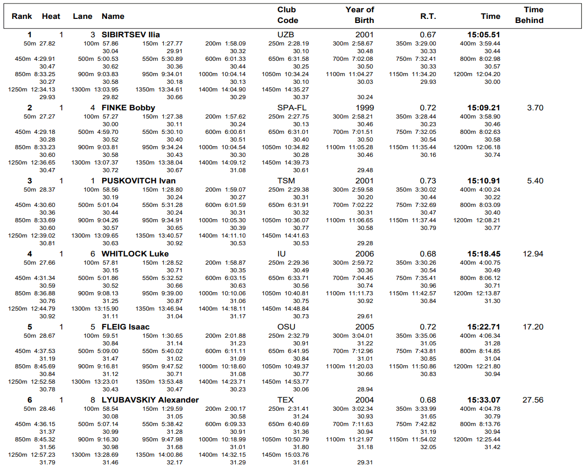 In the first of two men’s heats, Finke held the lead for the first half of the race, narrowly holding Sibirtsev, Ivan Puskovitch and Luke Whitlock at bay, but Sibirtsev took over for good at the 950-meter mark and gradually extended his lead to 3.70 seconds by the finish. Sibirtsev, a former Louisville Cardinal who competed for Uzbekistan at the Paris Olympics, recorded a time of 15:05.51 in his victorious effort.