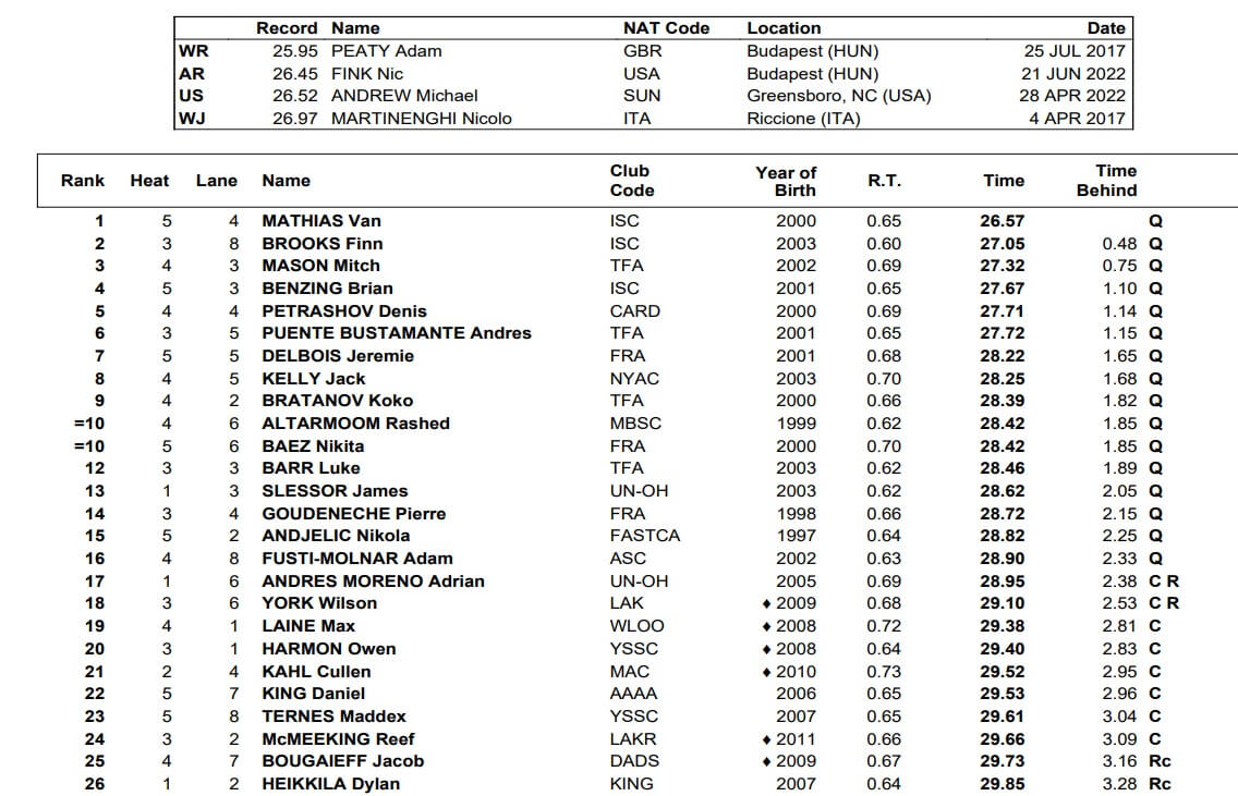 Indiana Swim Club’s Van Mathias (26.57) and Finn Brooks (27.05) claimed the top two seeds, while teammate Brian Benzing was fourth (27.67).