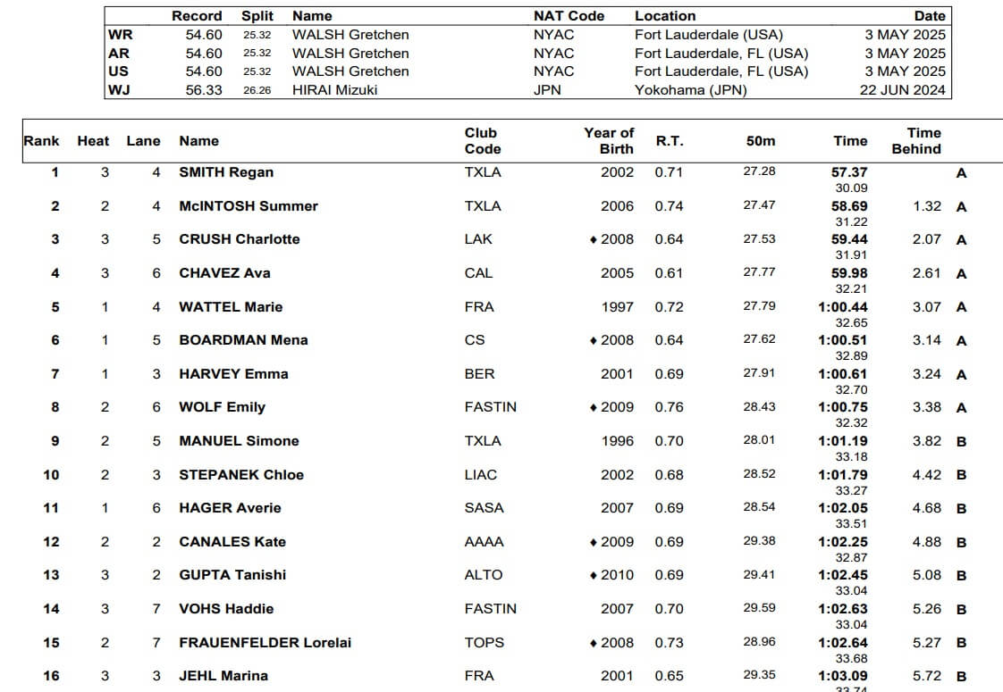 Charlotte Crush was third in prelims with a 59.44, followed by Ava Chavez (59.98), France’s Marie Wattel (1:00.44), Mena Boardman (1:00.61), Emma Harvey (1:00.61) and Emily Wolf (1:00.75).
