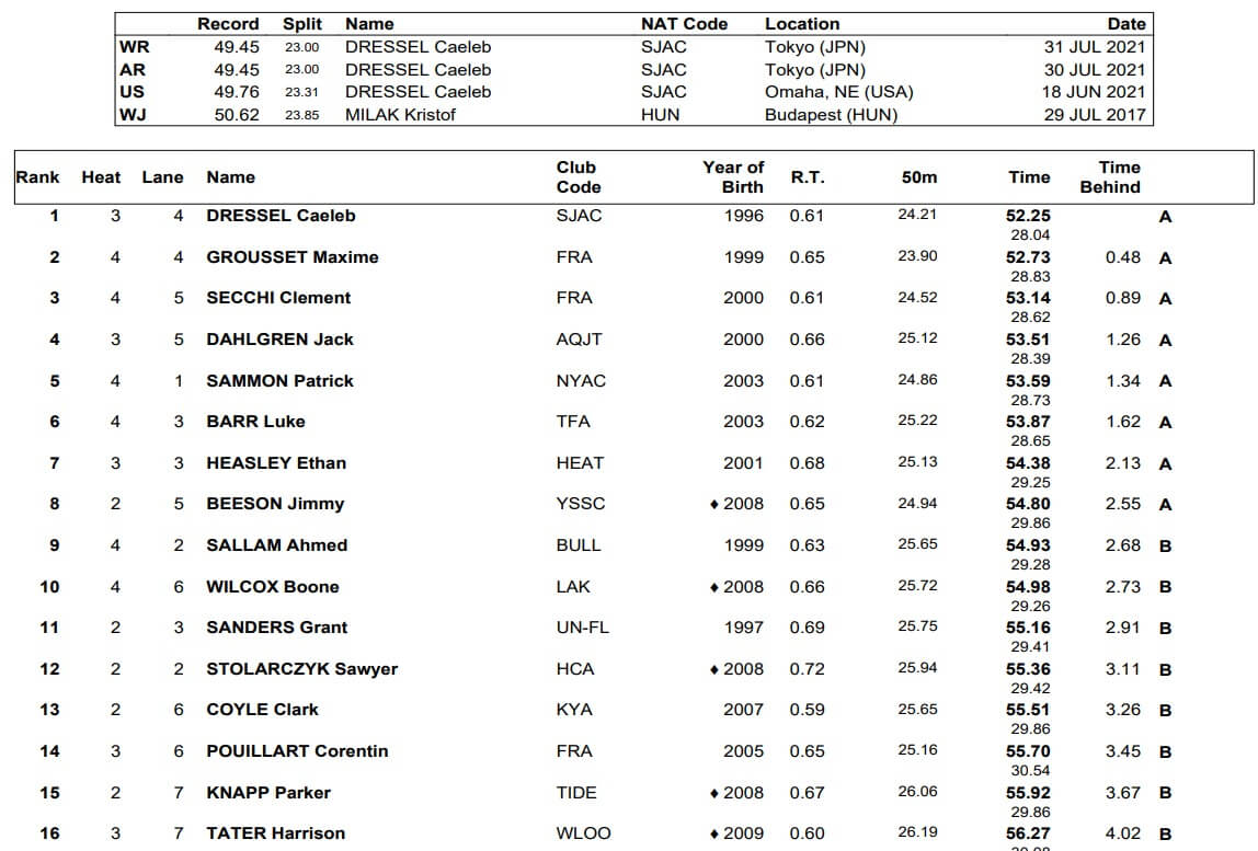 Jack Dahlgren took the fourth seed in 53.51, followed by Patrick Sammon (53.59), Luke Barr (53.87), Ethan Heasley (54.38) and Jimmy Beeson (54.80).