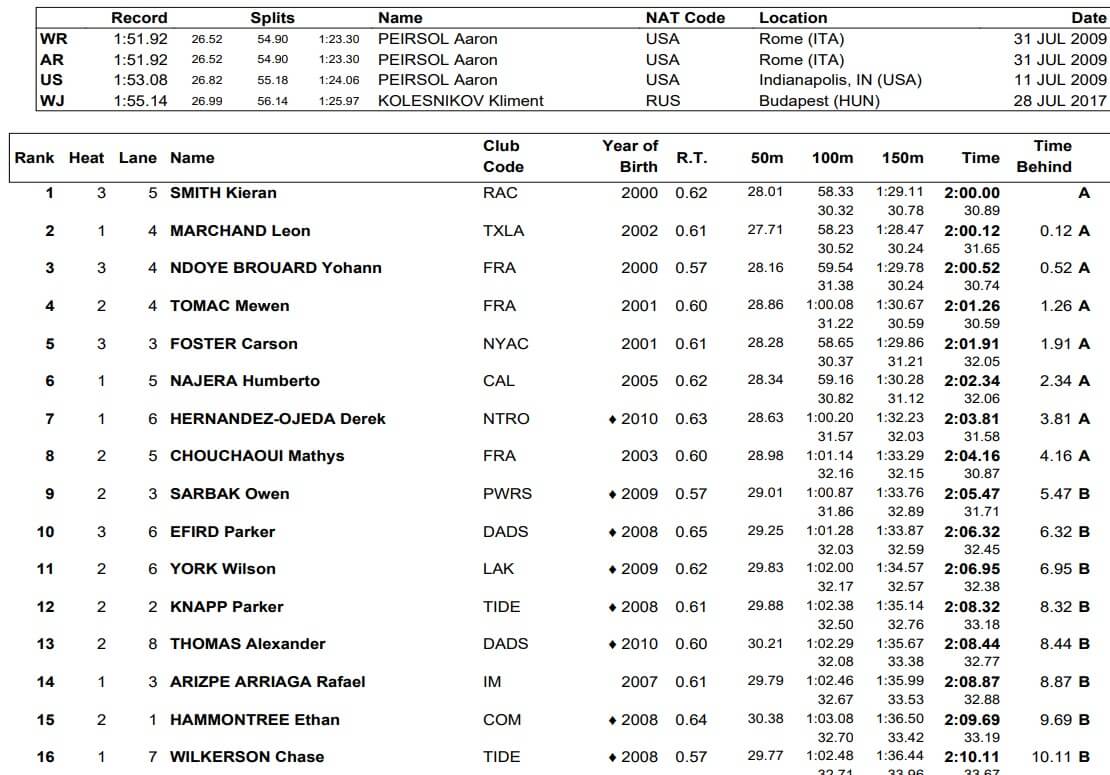 Smith, a U.S. middle distance free specialist, took the top seed in 2:00.00, while Marchand, the French Olympic gold medalist in the IM events was just behind in 2:00.12.