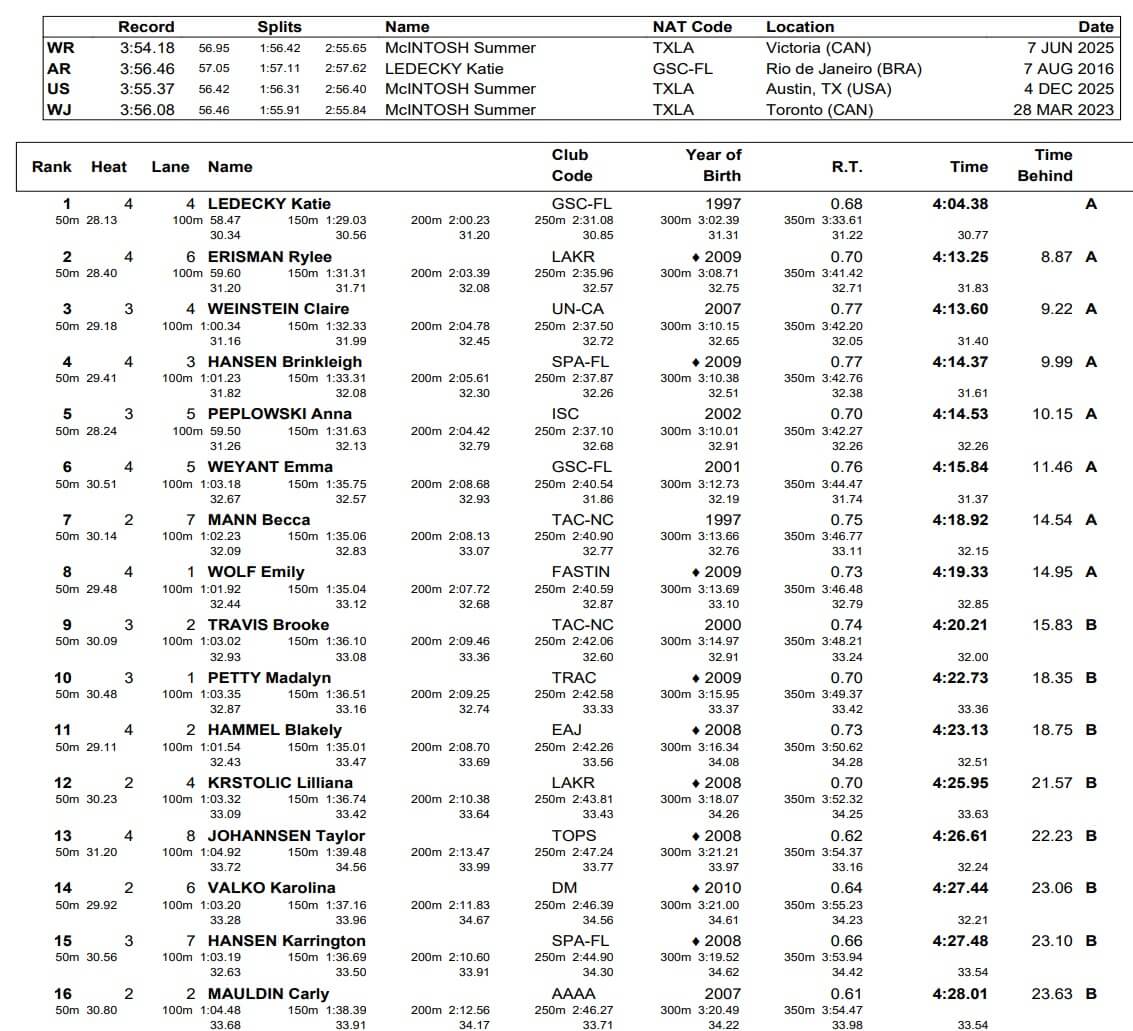 Rising star Rylee Erisman took the second spot in 4:13.60, ahead of Olympian Claire Weinstein (4:13.60) and Brinkleigh Hansen (4:14.37).