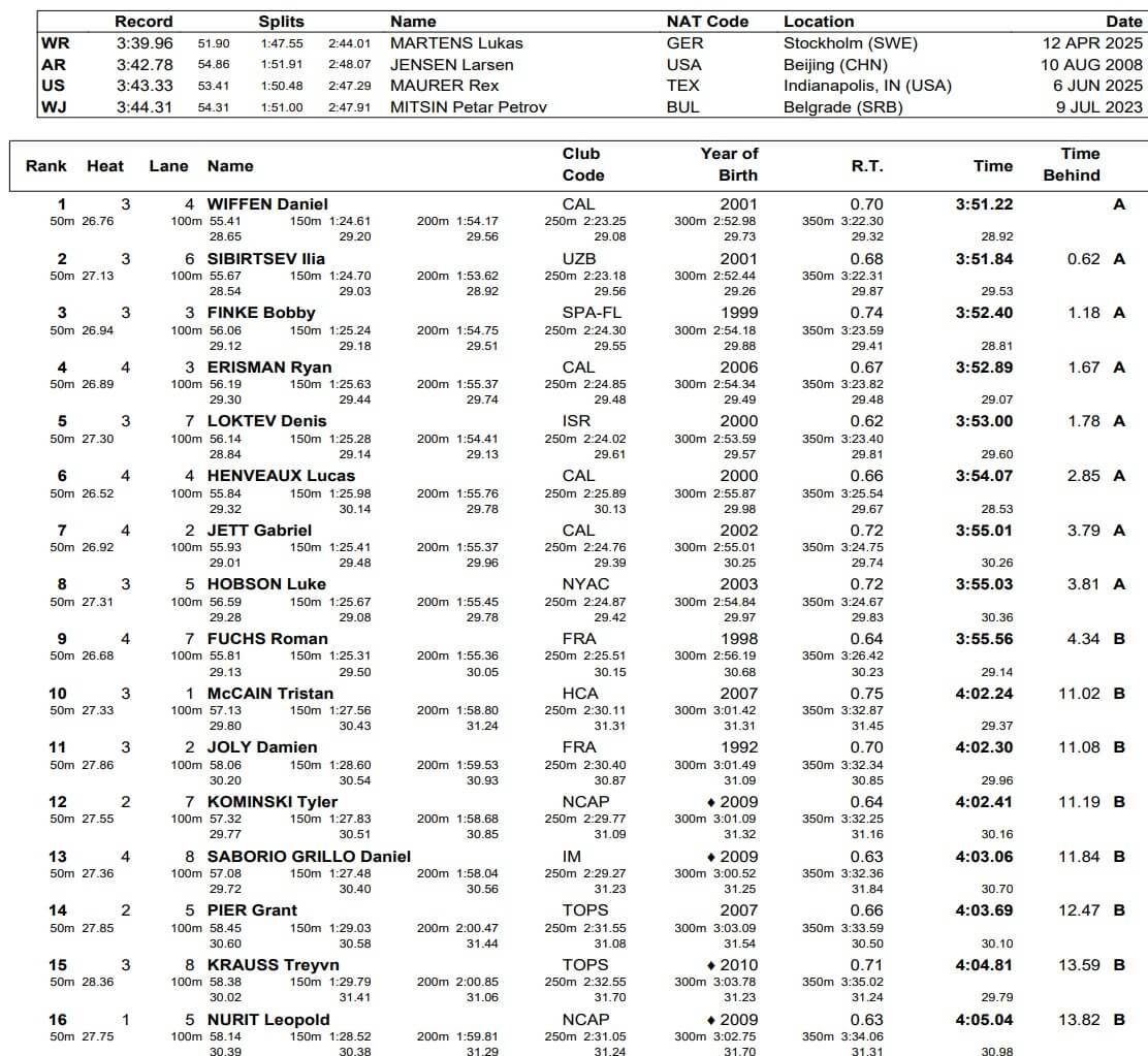 U.S. Olympian Bobby Finke took the third spot in 3:52.40, followed by Ryan Erisman (3:52.89), Denis Loktev (3:53.00), Cal’s Lucas Henveaux (3:54.07) and Gabriel Jett (3:55.01) and Olympian Luke Hobson (3:55.03).