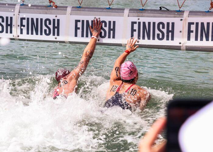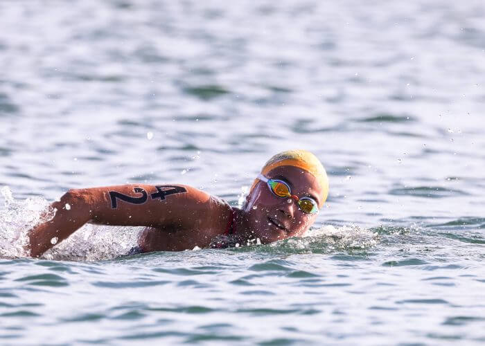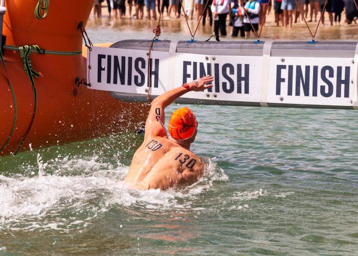 The day’s racing also featured aspiring LA and Brisbane 2032 Olympic talent in the 14-15 years’ boys and girls 5km events as swimmers were chaperoned around the 1.25km course by a local pod of dolphins.
