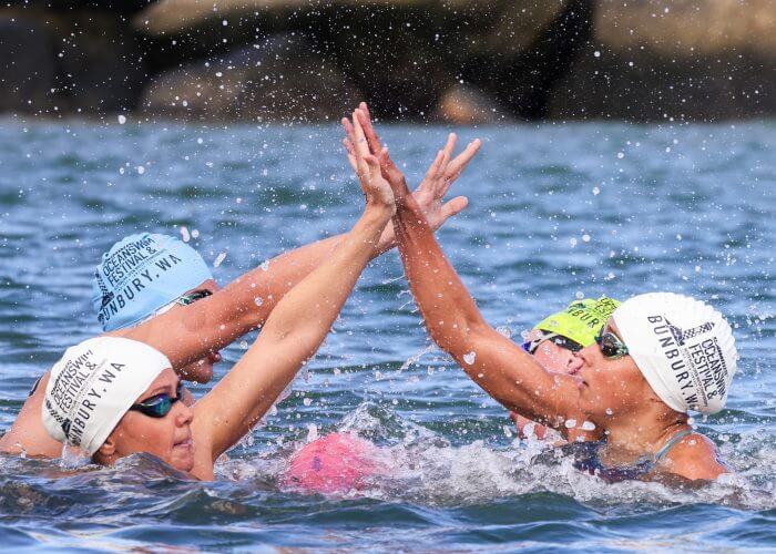 OPEN WATER SYNCHRO: High five changeovers in the 4x1500m relay.Photo Courtesy Adam Crane (Swimming Australia).