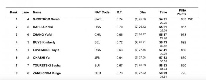 China’s Yufei Zhang was also in the mix after being nearly dead even with Dahlia at the fifty. Zhang ultimately finished in 55.87 to take third place.