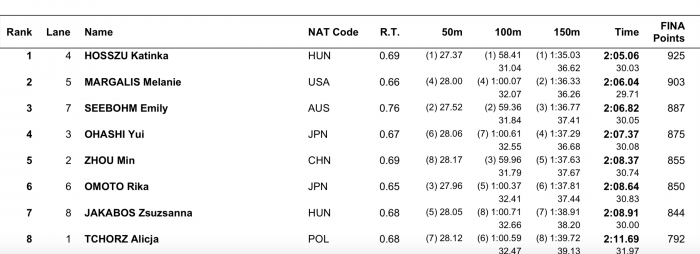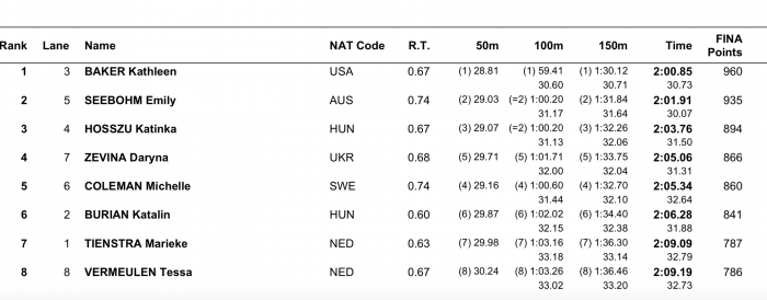 Seebohm was able to earn second with a 2:01.91 while Hosszu placed third in 2:03.76.