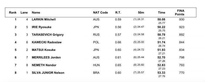 The swims were distant from the World Record of 48.90 held by Russia’s Kliment Kolesnikov, but were not far behind Larkin’s 2016 World Championship gold-medal time of 49.65. Tarasevich was only two-tenths off his time from this meet where he raced a 50.54 in the semifinals.