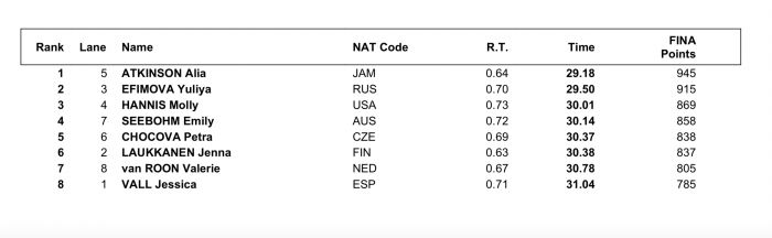 Alia Atkinson, three-time Short Course World silver medalist in this event, proved her dominance by winning the 50 Breaststroke in Eindhoven. After a quick start, she was able to fight off a charging Yuliya Efimova of Russia who took second in 29.50. The United States’ Molly Hannis was third in 30.01, just off her 29.76 from the prelims.