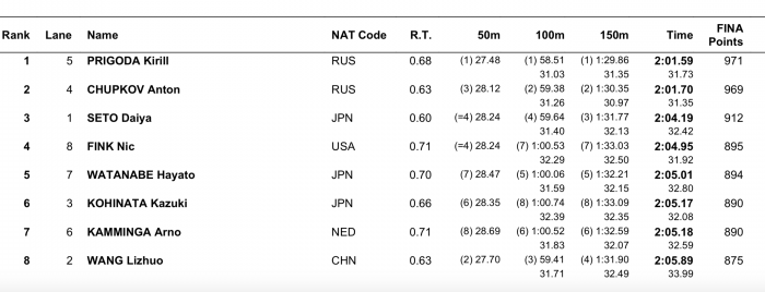 Japan’s Seto was out under one minute with the Russian men, but could not hang on after his 400 IM victory, falling to third in 2:04.19. Late efforts from the United States’ Nic Fink almost landed him in the top three, but he ran out of room in the end finishing fourth in 2:04.95.