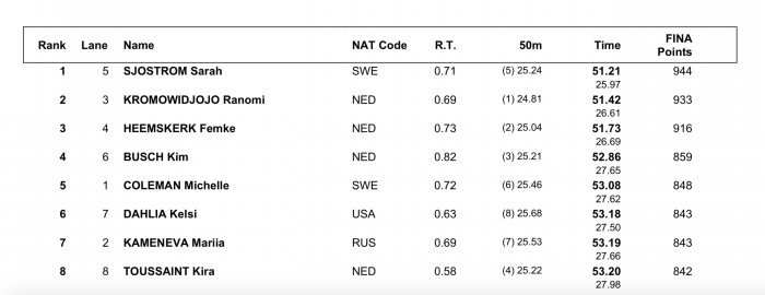 Sjostrom was soon back in the pool for another close race, this time in the 100 Freestyle. Her efforts of 51.21 broke up an otherwise Netherlands-dominated sprint event. The team had the next three-fastest swimmers in Eindhoven, as Ranomi Kromowidjojo (51.42), Femke Heemskerk (51.73) and Kim Busch (52.86) placed second through fourth. Teammate Kira Toussaint also finished eighth in 53.20.