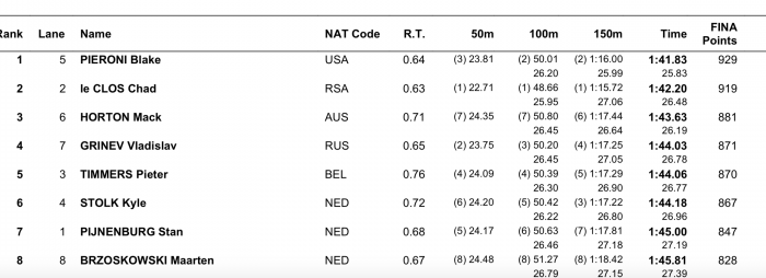 Le Clos, as always, was off to a fast lead which he held through the 150 mark. But Pieroni was the only swimmer to split under 26 on the last fifty, coming home in 25.83 to chase down le Clos (1:42.20).
