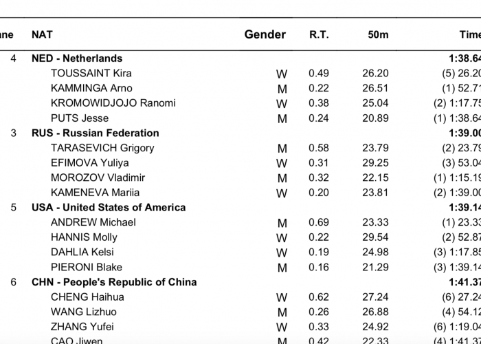 As predicted, the Netherlands continued their momentum from the sprint events into the Mixed 4 x 50 Medley Relay. Up against big names Tarasevich and Michael Andrew, Toussaint started the team off in fifth with a 26.20 backstroke leg. Arno Kamminga then put them back into the race with a 26.51 breaststroke split to catch Efimova and Hannis.