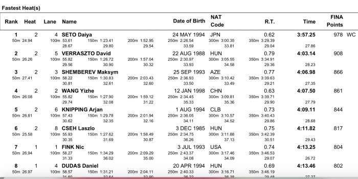 Hungary’s David Verraszto earned runner-up honors in 4:03.14 and was followed by Maksym Shemberev in 4:06.98. China’s Yizhe Wang was not far off the podium in 4:07.50. The latter had a race down to the finish after Wang had a four-second lead at the halfway point. Shemberev’s freestyle split of 56.56 was the fastest in the field, even three-tenths better than that of Seto.